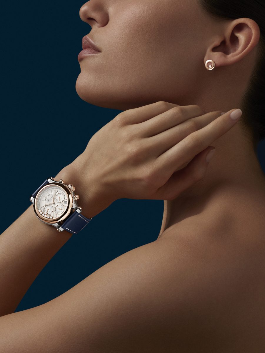高貴優雅而運動感十足,這款計時腕錶實際上是複雜功能腕錶,與Happy Sport系列的風格個性完全一致,相互共鳴。系列於1996年引入計時功能,如今為全新Happy Sport Chrono腕錶賦予迷人魅力。在符合倫理道德標準的18K玫瑰金錶殼或精鋼及符合倫理道德標準18K玫瑰金的雙材質錶殼右側,設計師在不違背系列獨有的圓潤廓形造型與和諧感下,增添了兩枚別具特色的按鈕。