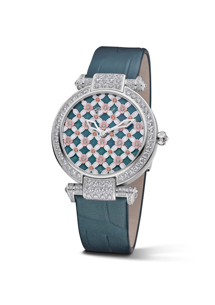 IMPERIALE系列以蕭邦超凡藝術工藝彰顯端莊雋雅的女性魅力,此系列融匯了蕭邦手工藝大師豐富紛呈的超凡技藝,以藝術工藝綻現製錶創舉的迷人魅力。新增的時計亦不例外,採用符合倫理道德標準18K白金鑲鑽的36毫米直徑錶殼,搭載Chopard 96.17-C型機芯,精緻錶盤綴以珍珠母貝細工鑲嵌和琺瑯裝飾。