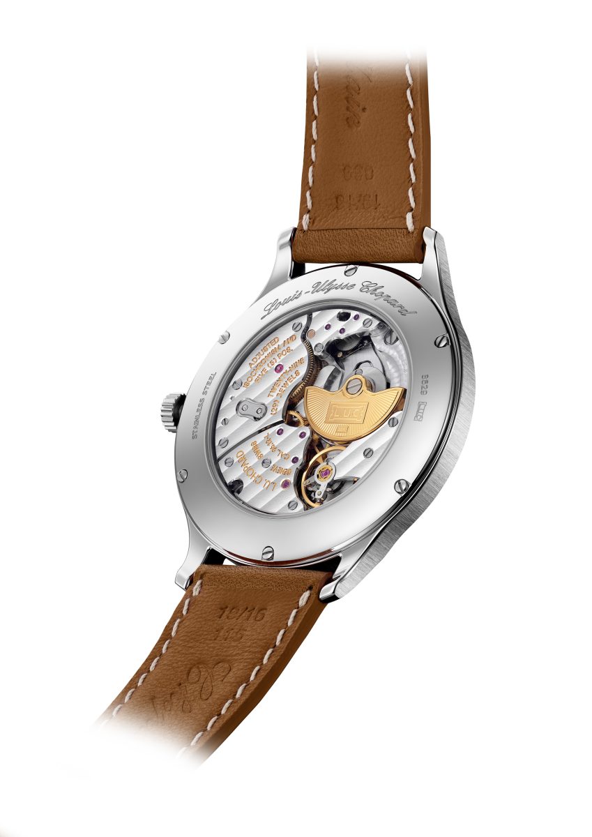L.U.C 96.12-L型超薄機芯僅厚3.3毫米,配備22K金雙向微型擺陀,以及採用蕭邦Twin專利技術的疊置雙發條盒,動力儲存長達65小時。錶橋經細緻倒角,並飾有日內瓦波紋,透過錶殼的透明底蓋一覽無遺。 此腕錶XPS中的字母「S」即指設於6時位置的小秒盤。小秒盤遵循瑞士官方天文台要求而設,藉助此時間顯示功能評估所認證的機芯精準性能,確保腕錶每天運行的平均誤差在-4至+6秒之間。