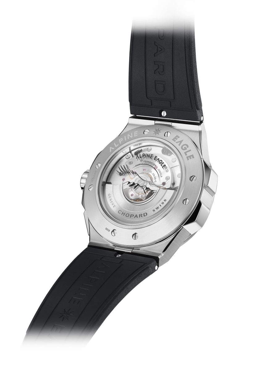 機芯具備60小時動力儲存,配備了單向齒輪系統,在保證快速自動上鏈的同時,還能防止能量損耗。此外,Chopard 03.05-C型機芯還配備停秒功能,更是為蕭邦贏得三項專利註冊。Alpine Eagle基金會以「保育阿爾卑斯山」為宗旨,蕭邦透過發售數款Alpine Eagle系列時計直接為基金會項目提供資金。此次發行的「隆河冰藍色」(Rhône Blue)全新錶盤的部分銷售收益將會捐贈予Alpine Eagle基金會。