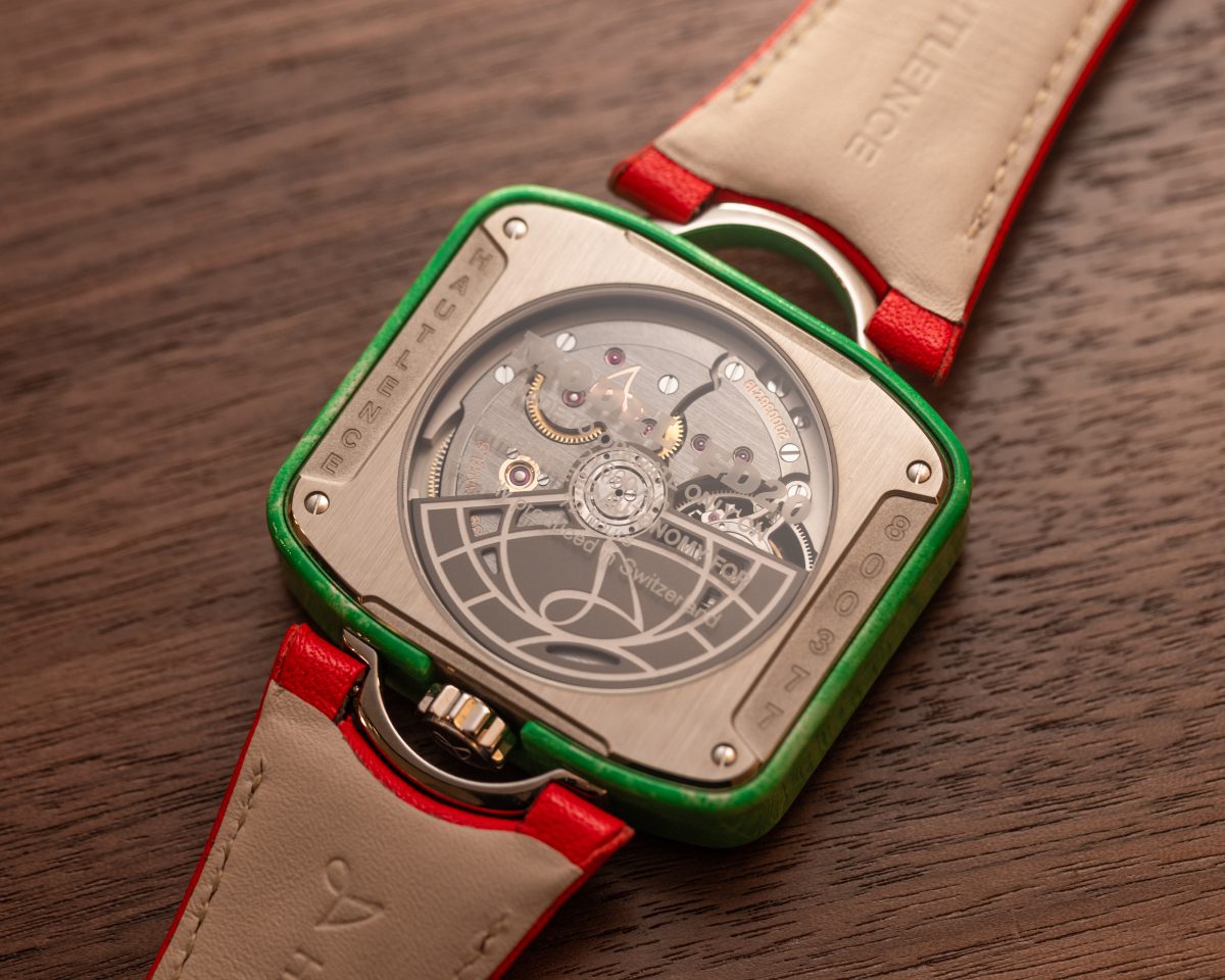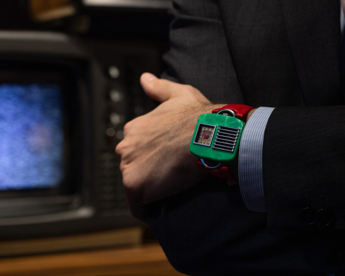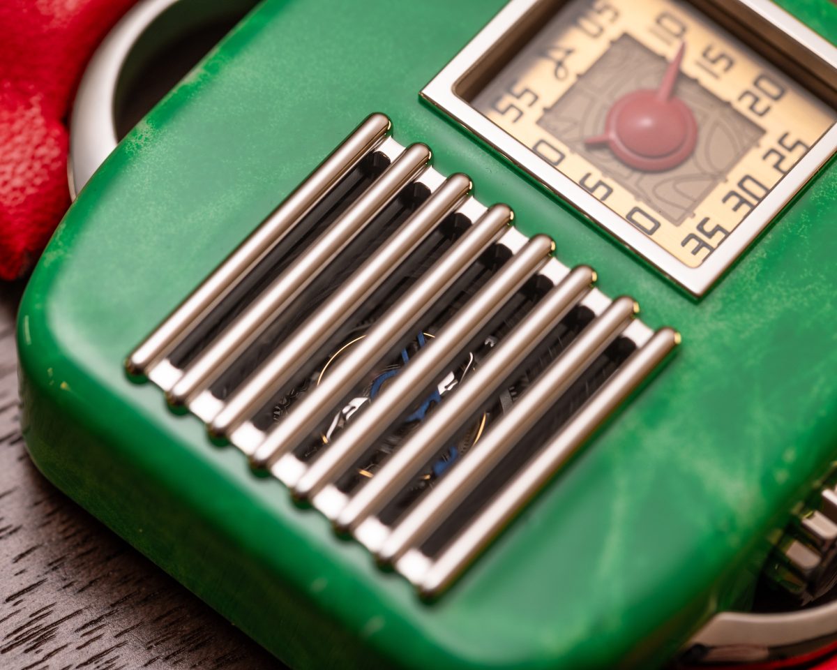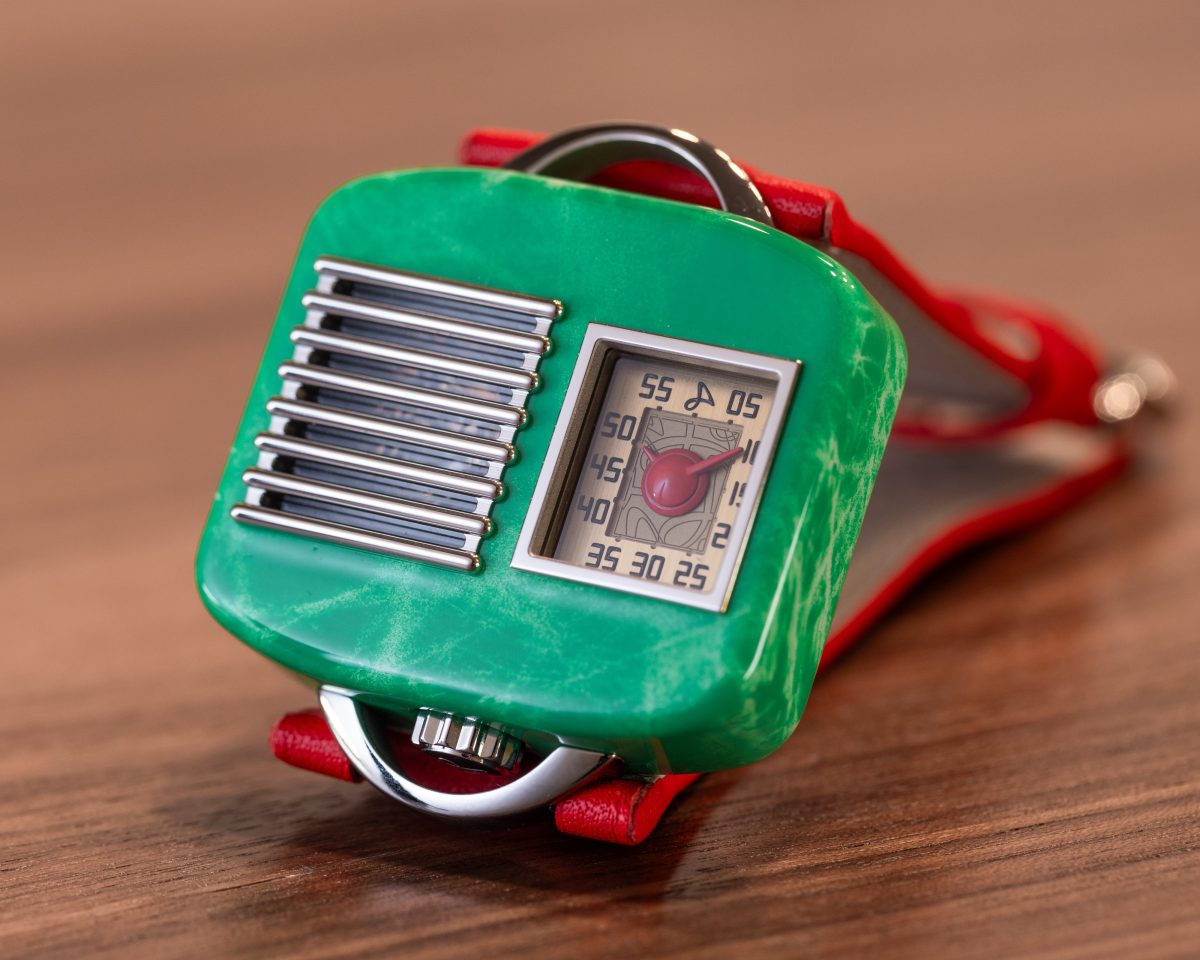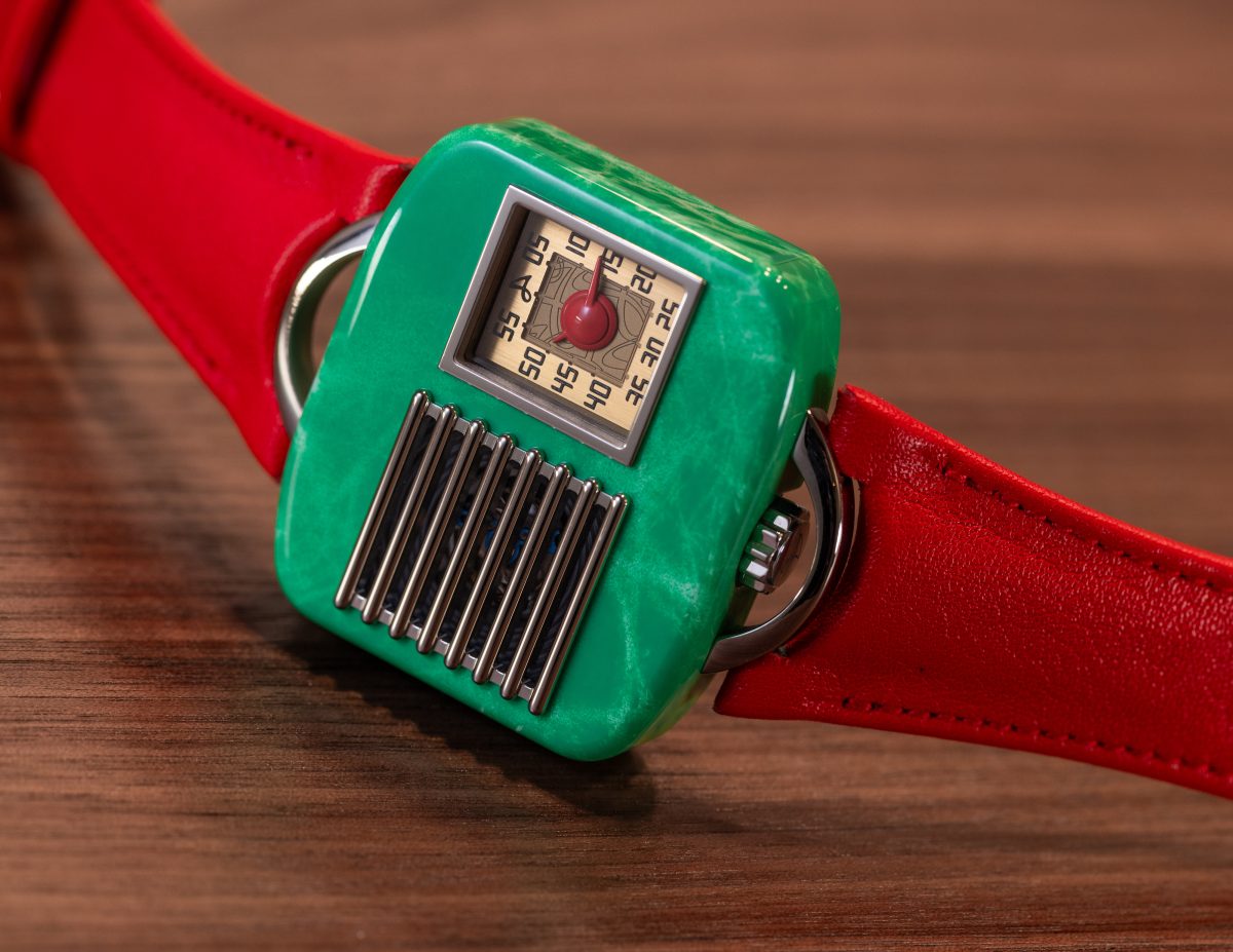 豪朗時 RETROVISION ‘47 採用手工彩繪錶殼精心打造,呈立方體形狀並帶有柔和的圓角,仿效古董廣播收音機外殼的綠色及白色大理石紋電木外觀。就像是將收音機微型化轉換成手上腕錶,作為錶耳的白色連接件外型有如提把,錶冠位於 6 點鐘位置,以保持錶殼的對稱性。紅色皮革錶帶為這款來自豪朗時歷史另一條時間線的超凡創作增添復古氣息。