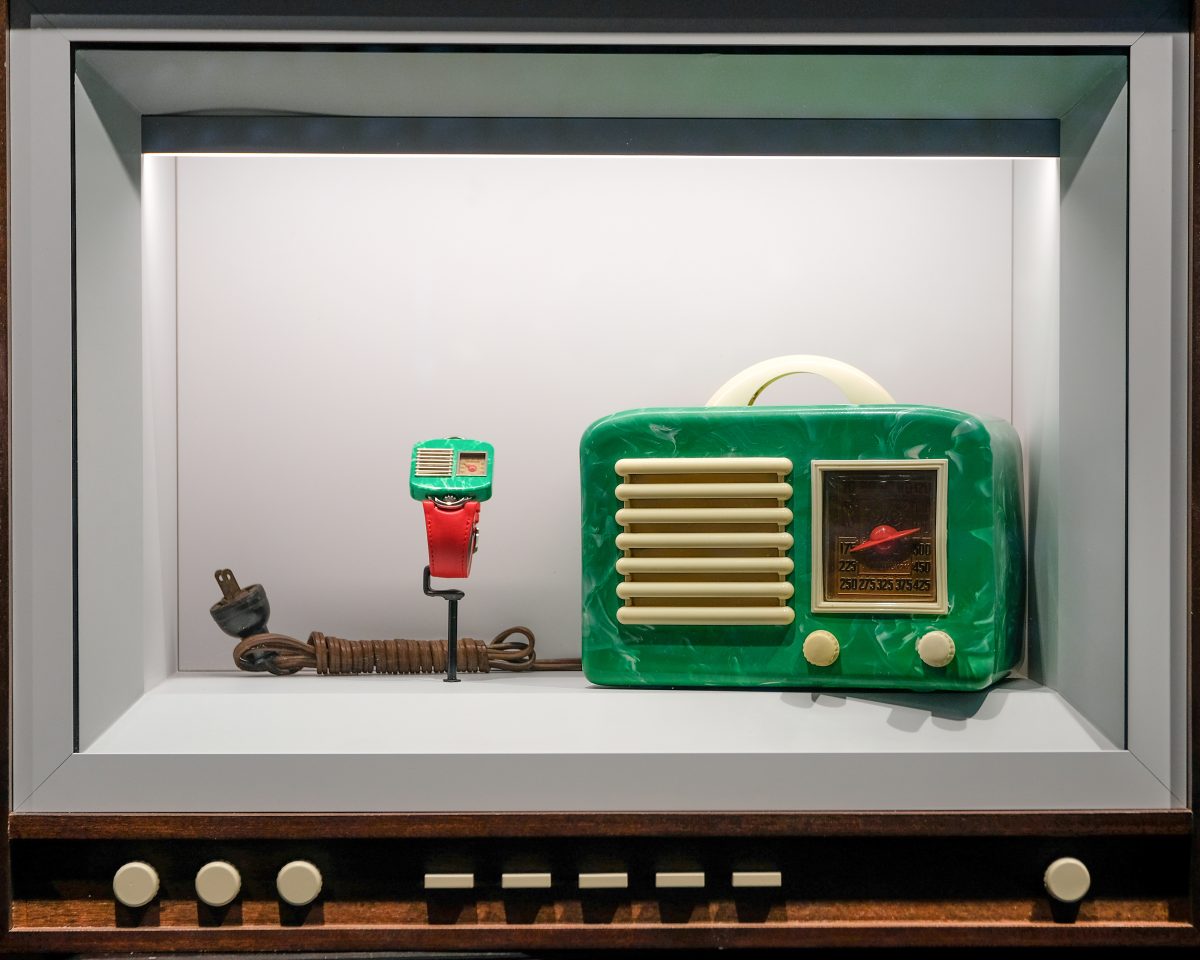 這件出色作品最終的靈感來源並不是古早的電視機,但已經相當接近。芝加哥通用電視廣播公司(General Television & Radio Corp. Chicago)於1940 年代製造的「Model 5A5」雖然是一台無線電廣播收音機,其設計卻成為了當時電視機外形的範本,包括將螢幕和揚聲器分隔開來,以及配備面盤及旋鈕。芝加哥通用電視廣播公司 的Model 5A5 不僅可在家中輕鬆移動,而且近乎一件雕塑品,有著引人注目的視覺效果,代表了造型與功能的完美結合,呈現屬於自己的獨特外觀 。