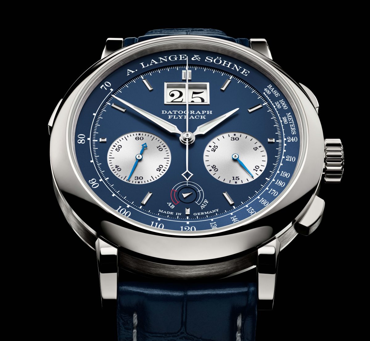 1999 年,DATOGRAPH 憑藉全新開發的錶廠自製機芯和獨一無二的錶盤設計,開創了短時間測量複雜功能的新時代。為紀念其誕生 25 週年,這款先驅計時碼錶現推出 18K 白金材質的 DATOGRAPH UP/DOWN 版本,配備藍色錶盤,限量 125 枚。