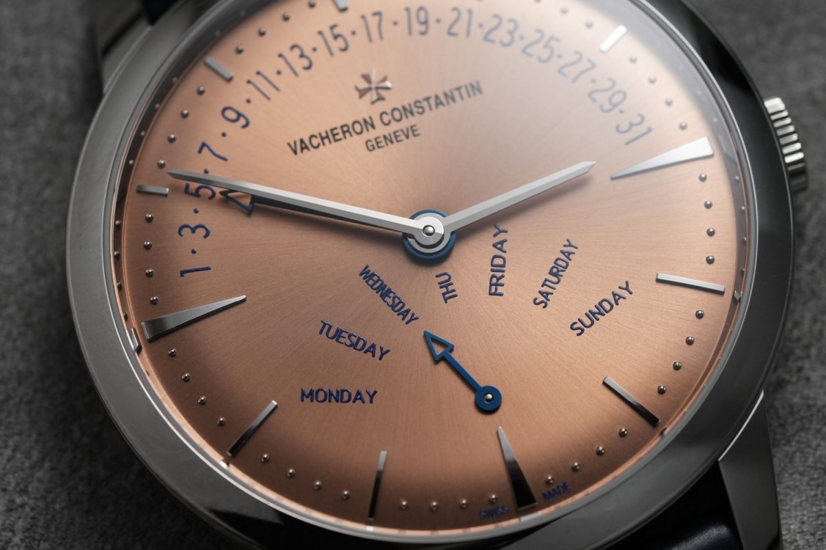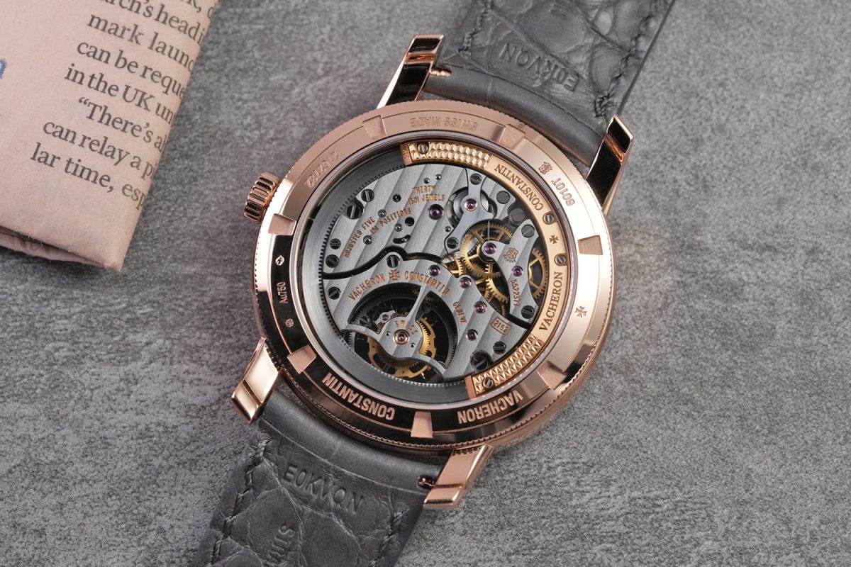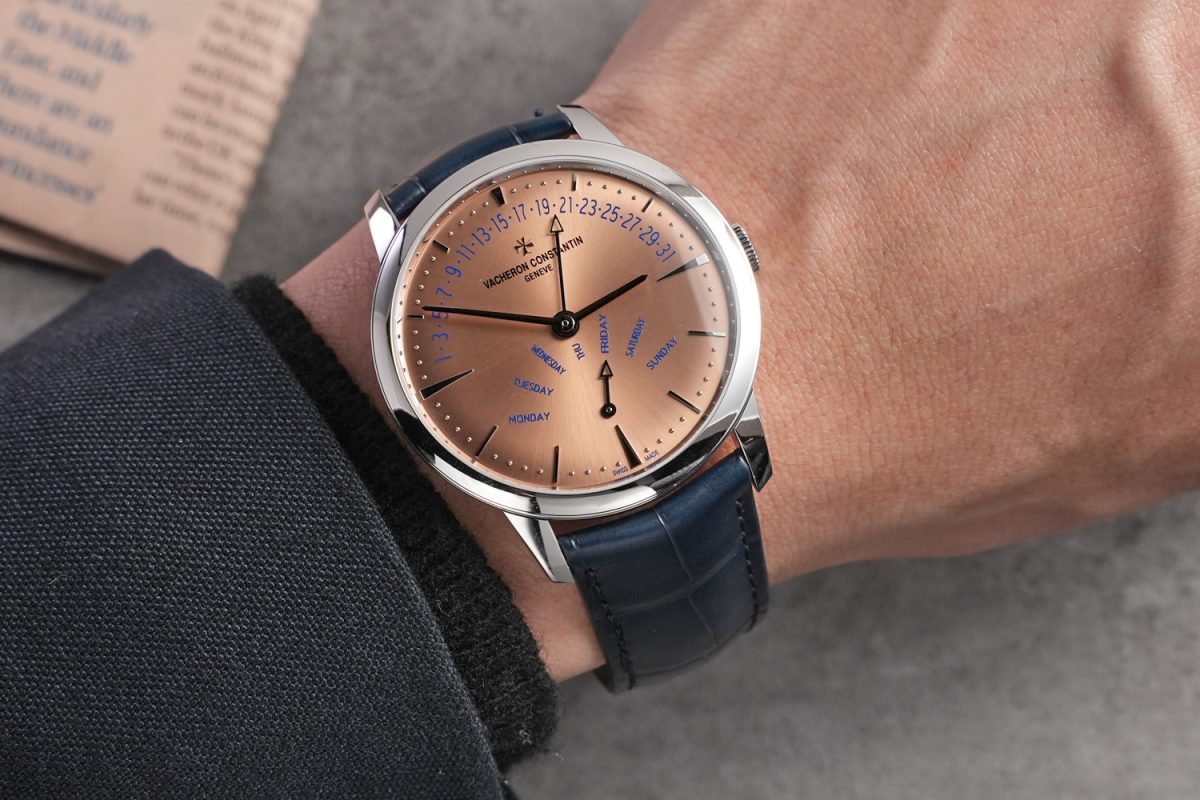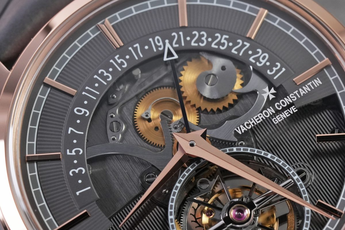江詩丹頓透別設計半鏤空錶盤,與逆跳日期搭配出獨特的視覺美感。