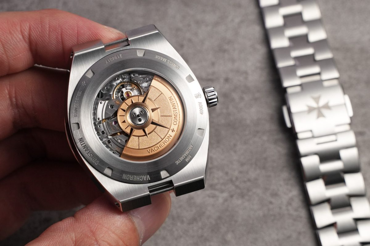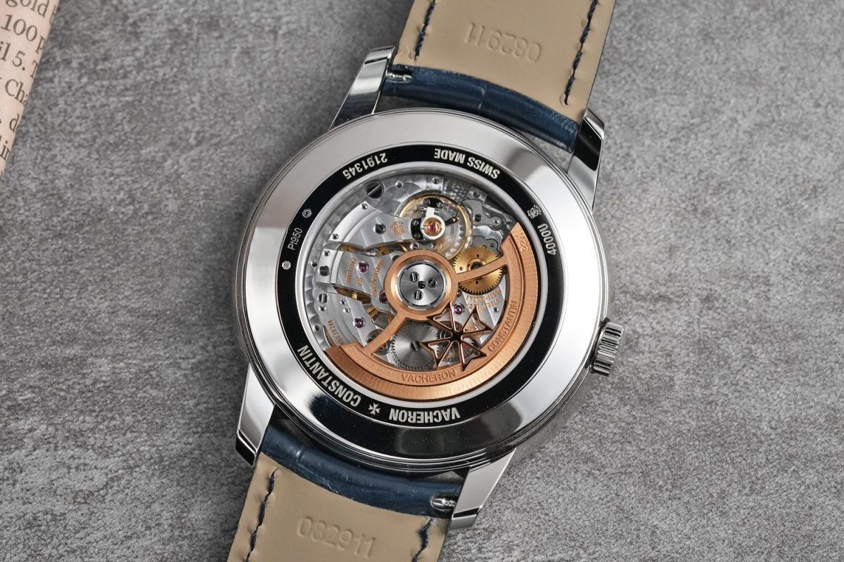 新款Patrimony逆跳星期日曆腕錶搭載品牌自製2460 R31R7/3自動上鍊機芯,配備以品牌標識馬耳他十字為造型的22K金質鏤空自動盤,秉承品牌自製機芯的精湛裝飾傳統,板橋邊緣經由手工拋光倒角處理。零件翼面同樣以精細手工直紋打磨,甚至螺絲亦經過精心拋光。機芯主夾板兩側均採用圓形粒紋裝飾,橋板背面以日內瓦波紋打磨裝飾。